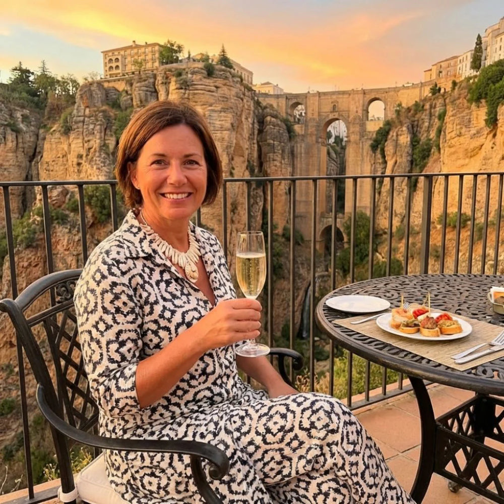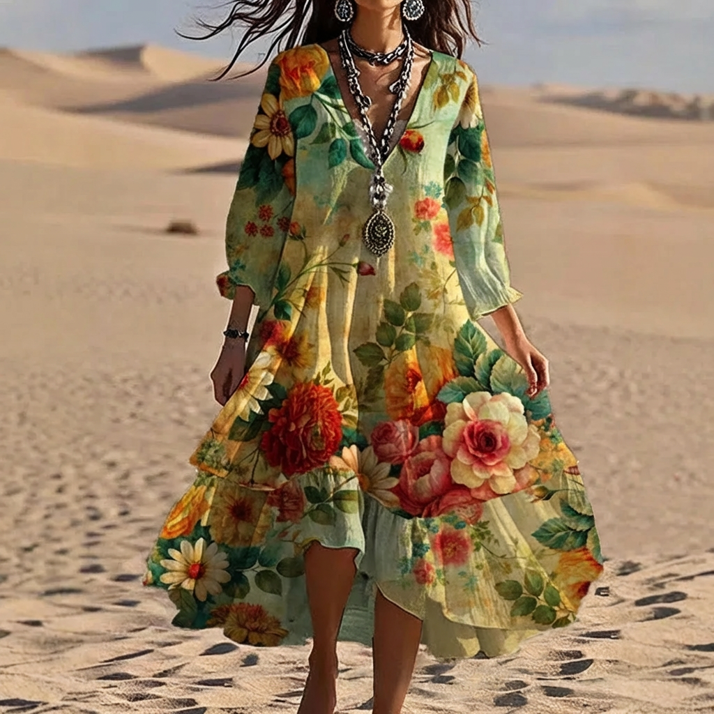 Adriana está diseñado para mujeres que buscan un vestido elegante con un espíritu libre y natural. El vibrante estampado floral aporta un toque artístico y bohemio, mientras que la silueta fluida se mueve con suavidad creando un look relajado pero sofisticado. Perfecto para paseos, vacaciones o momentos en los que quieres sentirte cómoda y elegante al mismo tiempo.